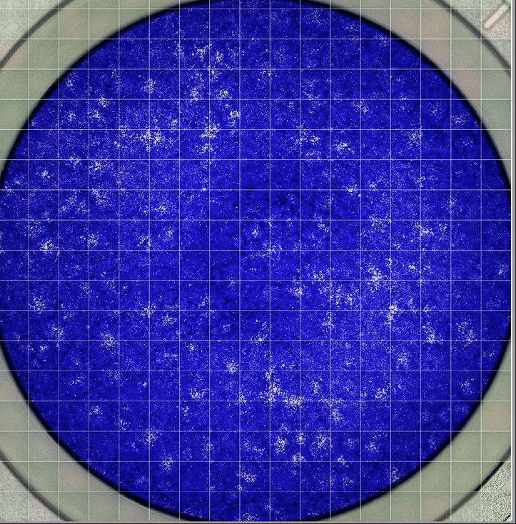 Orthopoxvirus titration using high resolution imaging. Cells are infected with serial dilution of VACV and stained with crystal violet. Following fixation, 24 well plate is scanned on Thermo Fisher Scientific CX7 Cellinsight.